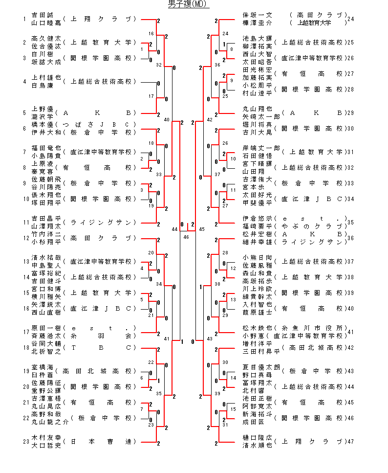 | 47 決勝 | 長谷川拓也(ライジングサン) 樋口隆広(上越翔破クラブ) | 2-0 | 保坂一文(高田クラブ) 小杉翔平(ライジングサン) |
