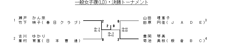 | 3 決勝 | 瀬戸 かん奈 竹下 映子(春日クラブ) | 2(15- 3 15-12)0 | 豊岡 琴美 菊池 美枝(板倉BC) |