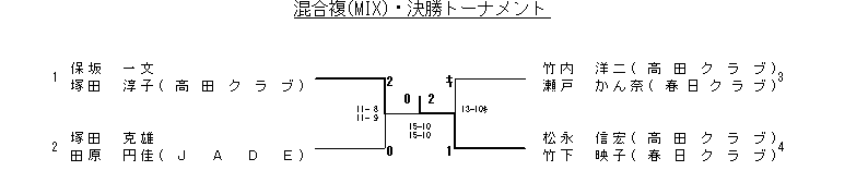 | 3 決勝 | 松永 信宏(高田クラブ) 竹下 映子(春日クラブ) | 2(15-10 15-10)0 | 保坂 一文 塚田 淳子(高田クラブ) |