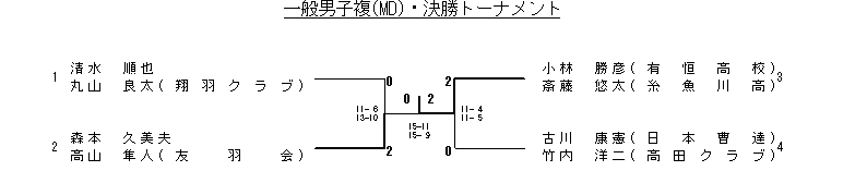 | 4 | 小山 和弘 上野 優(翔羽クラブ) | 2(11- 4 11- 6)0 | 青代 和男(あすなろ) 斉藤 英明(JADE) |