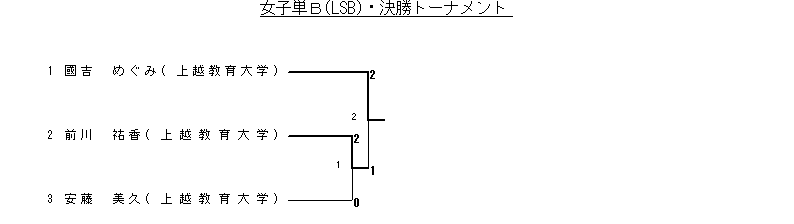 | 2 決勝 | 國吉 めぐみ(上越教育大学) | 2( 8-11 13-10 11- 9)1 | 前川 祐香(上越教育大学) |