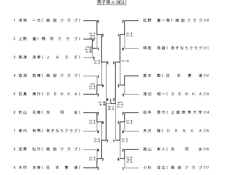 | 5 | 保坂 一文 松野 憲一郎(高田クラブ) | 2(11- 6 11- 4)0 | 小杉 信広 笠原 弘行(高田クラブ) |