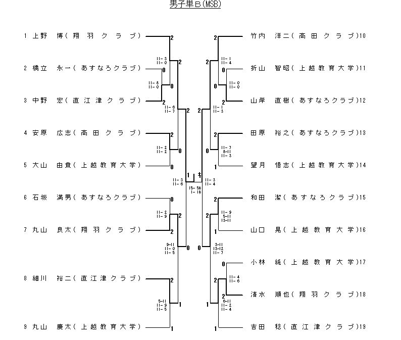 | 15 準決勝 | 松野 憲一郎(高田クラブ) | 2( 9-11 11- 0 11- 1)1 | 白井 啓太(上越教育大学) |