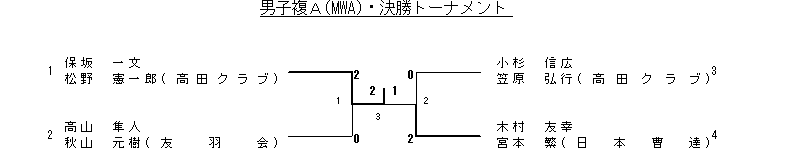 | 3 | 保坂 一文 松野 憲一郎(高田クラブ) | 2(11- 2 11- 4)0 | 青代 和男 田原 裕之(あすなろクラブ) |