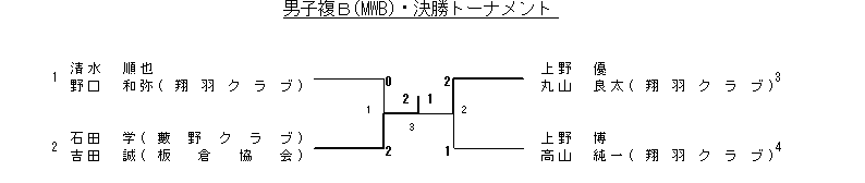 | 3 | 清水 順也 野口 和弥(翔羽クラブ) | 2(11- 2 5-11 13-10)1 | 石坂 満男 和田 潔(あすなろクラブ) |