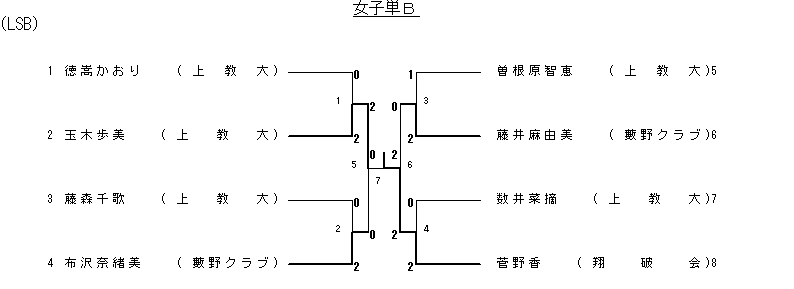 | 5 準決勝 | 玉木歩美 (上教大) | 2( 9- 8 9- 2)0 | 布沢奈緒美 (藪野クラブ) |