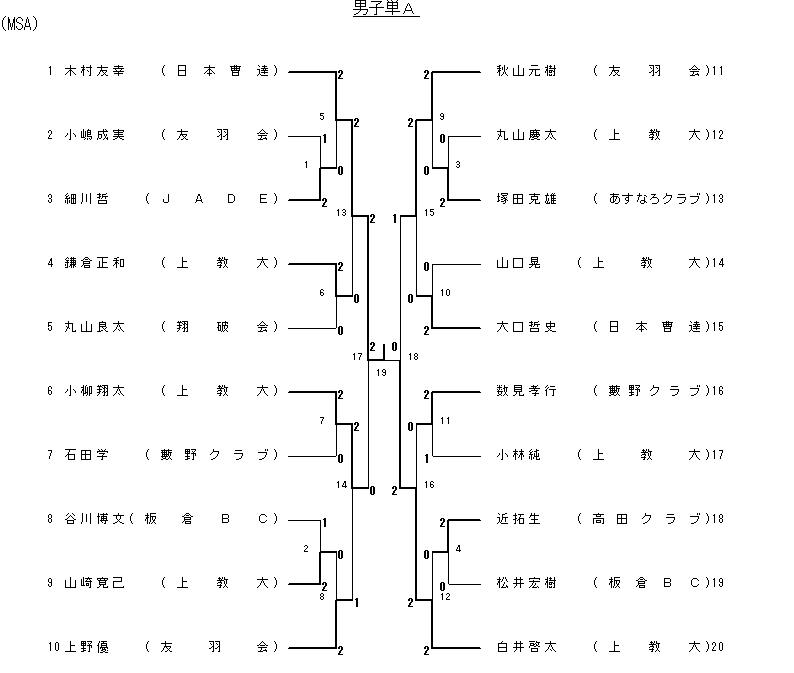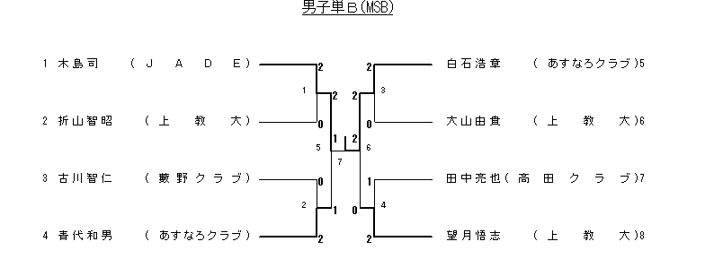 | 16 3回戦 | 白井啓太 (上教大) | 2(11- 2 11- 2)0 | 数見孝行 (藪野クラブ) |