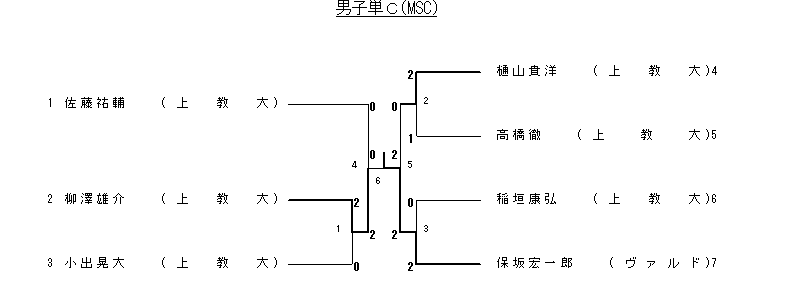 | 4 準決勝 | 柳澤雄介 (上教大) | 2(11- 7 11- 4)0 | 佐藤祐輔 (上教大) |