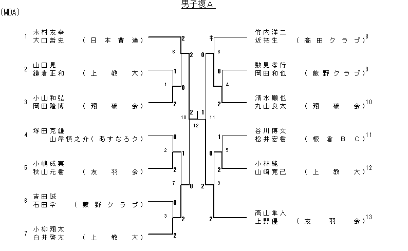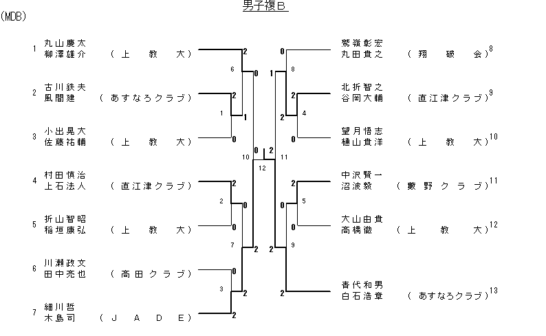 | 6 2回戦 | 鎌倉正和 (上教大) | 2(11- 4 11- 4)0 | 丸山良太 (翔破会) |