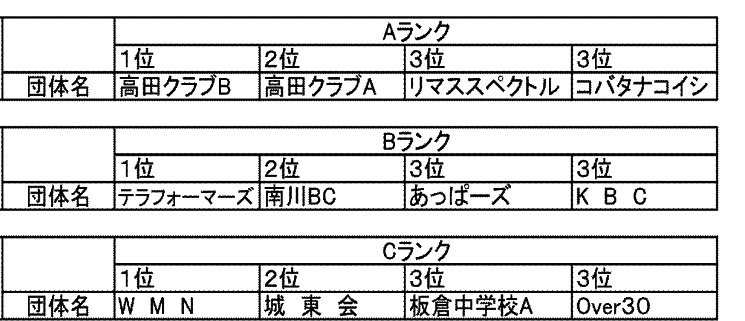 第3回上越オープン団体戦バドミントン大会 1.主 催 新潟県上越支部バドミントン協会 2.後 援 上越市教育委員会・一般財団法人上越市体育協会 3.主 管 上越市バドミントン協会 4.期 日 2016年12月18日(日) 5.会 場 リージョンプラザ上越 大会要項 http://www.j-bad.info/Taikai-youkou/2016-TC-OP.xls 大会結果